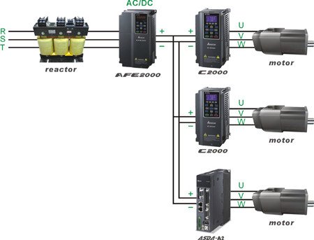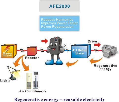 As a replacement for traditional brake resistors: A high-watts brake resistor is usually applied to a traditional AC motor drive to absorb the excess regenerative energy generated by motor spinning and frequent braking, and then dissipating the excess energy as heat (see Figure 1).. Using brake resistors as an excess energy solution not only creates additional hardware but also occupies more space. The Delta AFE2000 series provides a new solution: instead of dissipating regenerative energy as heat, it converts regenerative energy into reusable electricity and sends it back to the mains, which reduces total energy consumption. The AFE2000 series is a cost saving and environmentally-friendly product (see Figure 2).